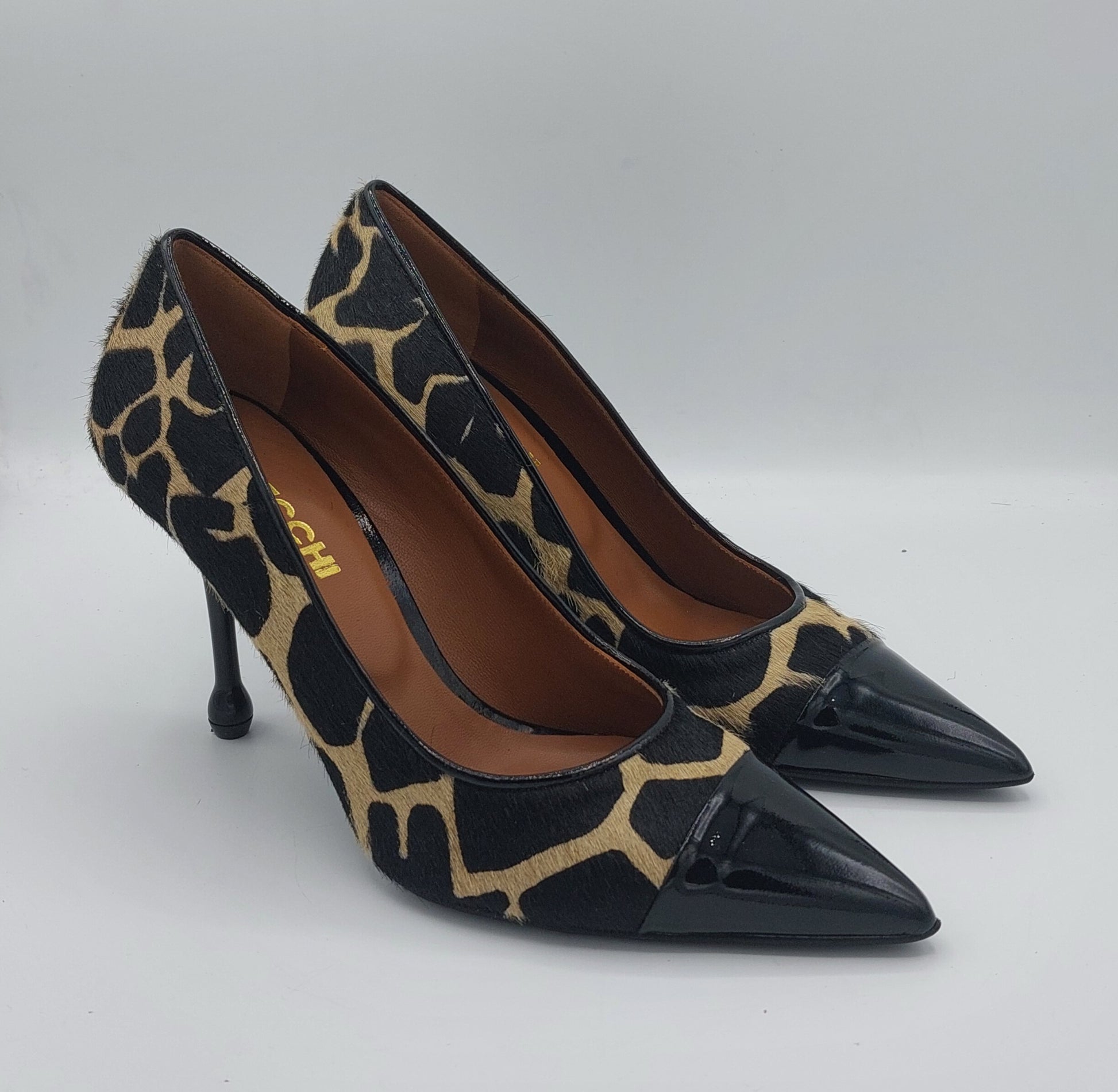 Décolleté in cavallino stampato giraffa con punta in vernice tacco alto