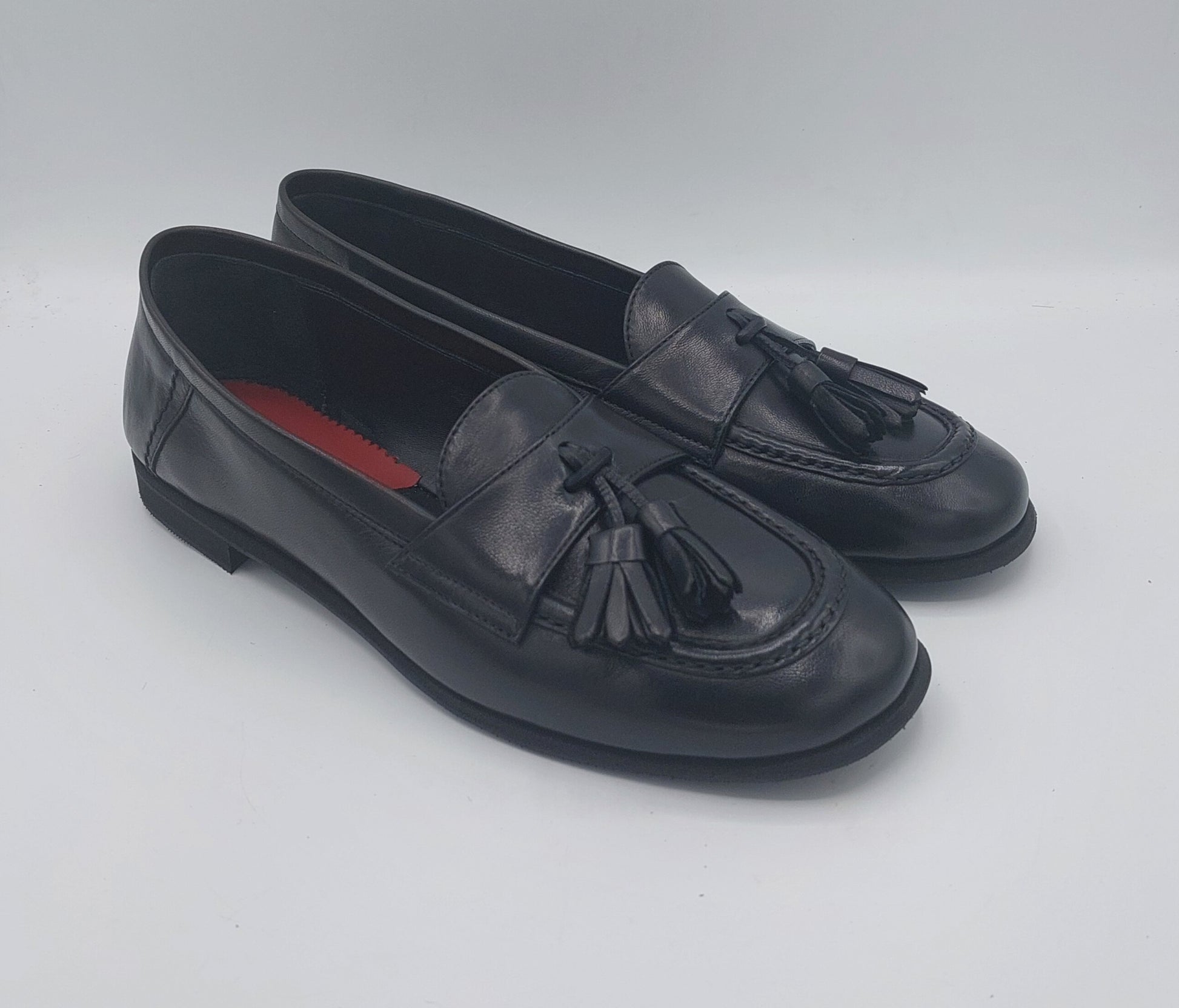 Mocassino in pelle nera lavorazione a sacchetto dettaglio con nappolina in tinta