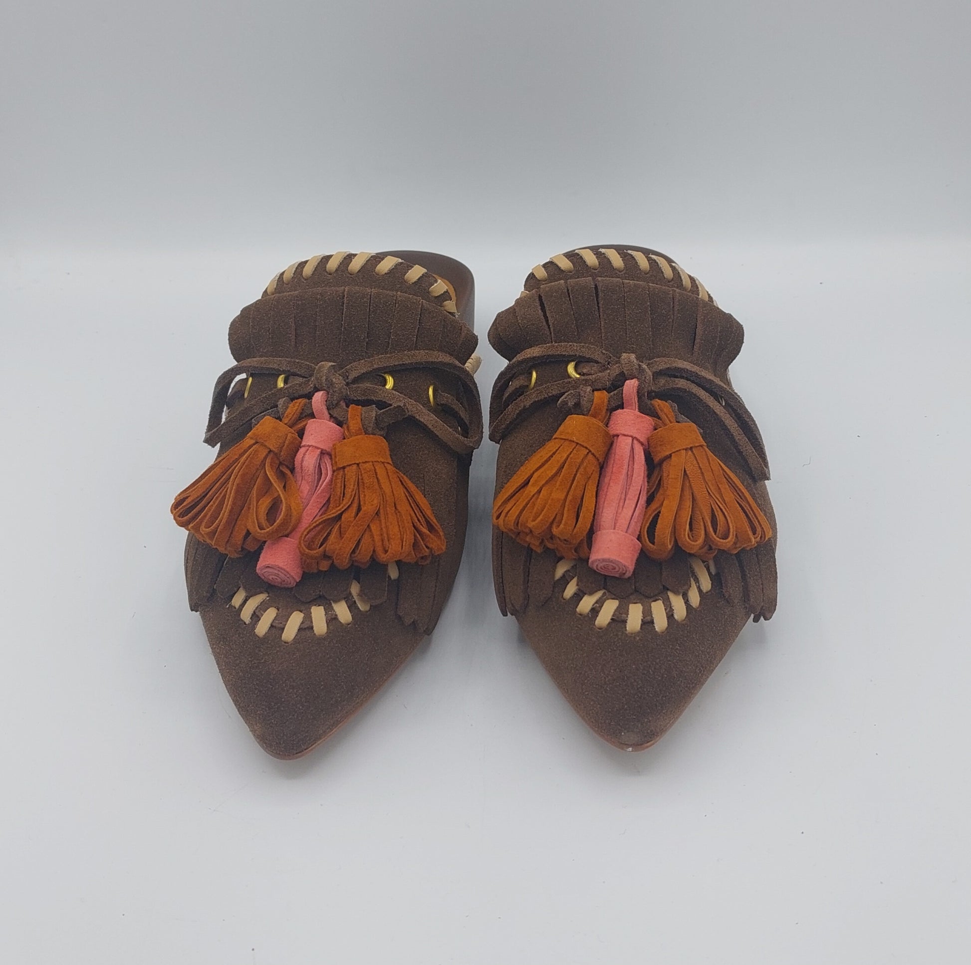 Bruno Premi sabot in camoscio marrone con nappole arancio